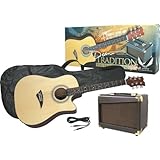 This Dean "Starter Pack" pairs a Dean Tradition acoustic-electric guitar with their Dean DA-20 acoustic guitar amp. A cable and gig bag are thrown in, so you have everything you need to get started playing--aside from practice, of course.